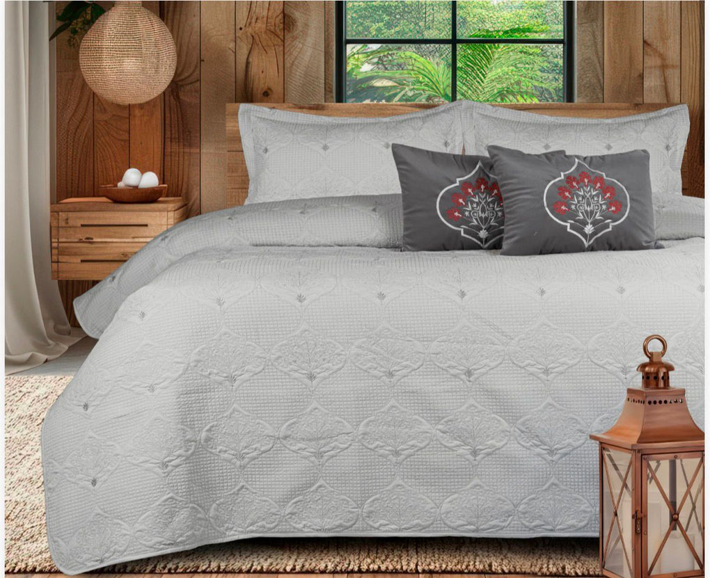 - Package Contents : 1 King size Quilted Bedsheet+ 2 Pillow cover + 2 cushion with filler.