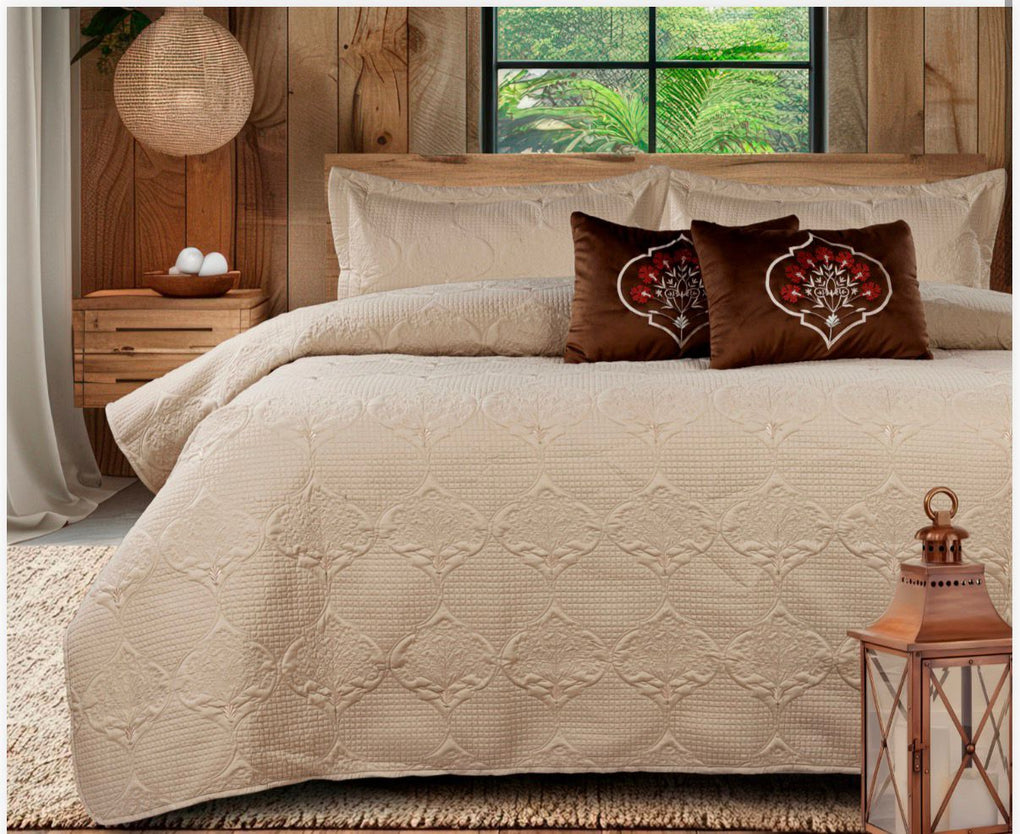 - Package Contents : 1 King size Quilted Bedsheet+ 2 Pillow cover + 2 cushion with filler.